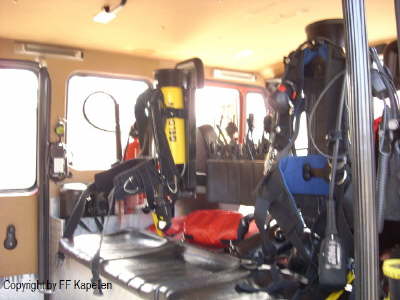 2 Atemschutzgeräte mit Atemanschluss für den Angriffstrupp7 HandsprechfunkgeräteCo² FeuerlöscherBergetuchFluchthaubenFeuerwehrleinenHandlampen